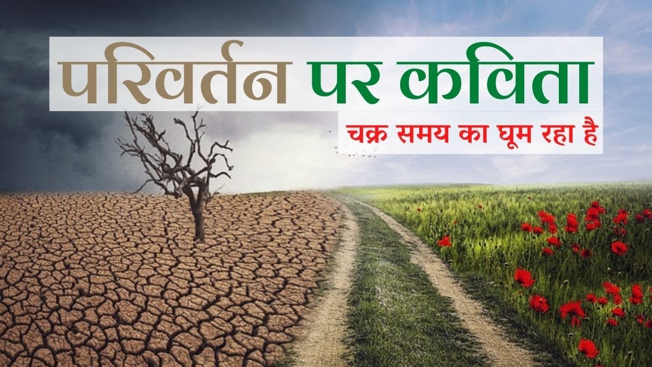 ‘ परिवर्तन पर कविता ‘ में बताया गया है कि इस दृश्यमान संसार में निरन्तर बदलाव होते रहते हैं। जड़ – चेतन सभी अपना स्वरूप निरन्तर बदलते रहते हैं। समय का पहिया बिना रुके लगातार घूमता रहता है। हर नया क्षण, बीते हुए क्षण से अलग होता है। समय के साथ ही हमारे जीवन में भी जाने अनजाने परिवर्तन होते रहते हैं। बचपन, यौवन और बुढ़ापा इसी परिवर्तन के रूप हैं। इस परिवर्तनशील जगत में जीवन की सार्थकता इसी में है कि हम सभी के साथ प्रेमपूर्वक व्यवहार करें।